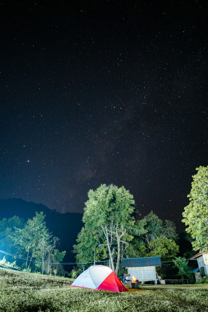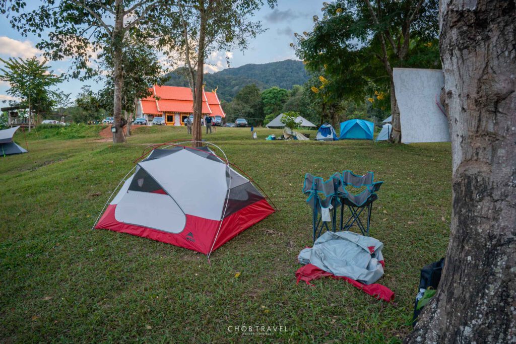 ขณะที่ไปถึงผมก็หาที่กางเต็นท์ บริเวณที่กางเต็นท์นั้นจะเป็นหญ้าเขียวชอุ่ม เป็นลานกางเต็นท์ที่มีพื้นหญ้าสวยสุดๆ อาจจะมีกิ่งไม้ตามพื้น ก่อนกางก็อย่าลืมระวังกิ่งไม้ แทงเต็นท์กันด้วย