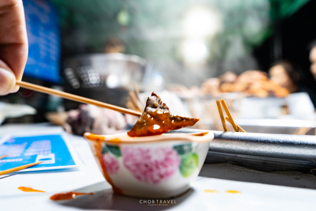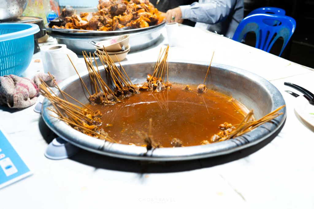 หลังจากได้นั่งเรือเที่ยวชมวัด ก็ถึงเวลาอร่อย แวะทานอาหาร ที่ถนนคนเดิน และที่ห้ามพลาดเลยก็คือ หมู่จุ่ม เป็นหมูและเครื่องในต่างๆต้มให้เครื่องหอมๆเสียบไม้ขายไม้ละ 1 บาท ให้เราได้หยิบทาน พร้อมกับน้ำจิ้มที่เหมาะกันจริงๆ พูดได้ว่า ใครมาแล้วไม่ได้ลองนั้นถือว่าพลาดมากๆ