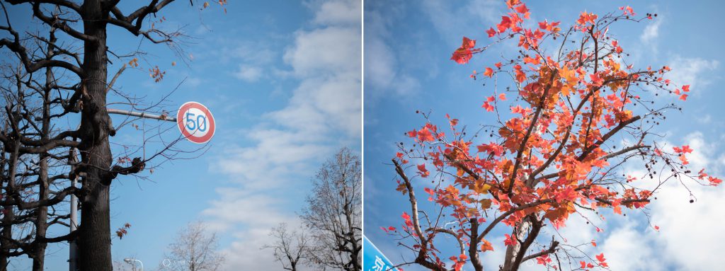วิวที่มองจากศาลาต้นไม้ลงไปจะเห็นต้นเมเปิ้ลสีแดงในช่วงฤดูใบไม้เปลี่ยนสี และ จะเห็นซากุระบาน ในช่วงซากุระบาน